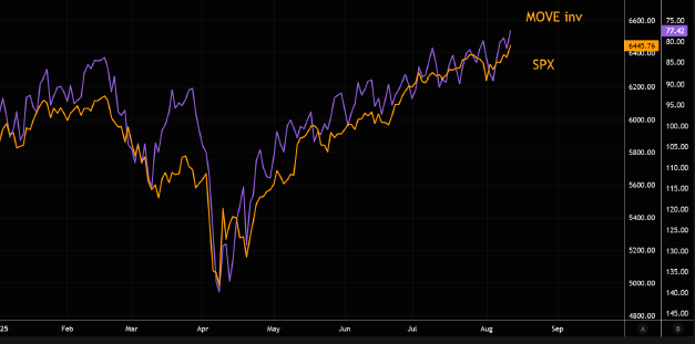 SPX는 채권 변동성의 역수와 높은 상관관계가 있음.
