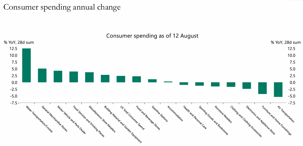 투자자들의 관심은 9월 한 달 동안 자금 조달 시장 위험으로 집중됨. TGA가 세금 납부와 재무부 결제로 목표 잔액인 850B정도로 잔고를 채움에 따라, ONRRP 상승을 제외하면 준비금은 월 중순까지 3T, 월말까지 2.9T 아래로 떨어질 것으로 예상됨.