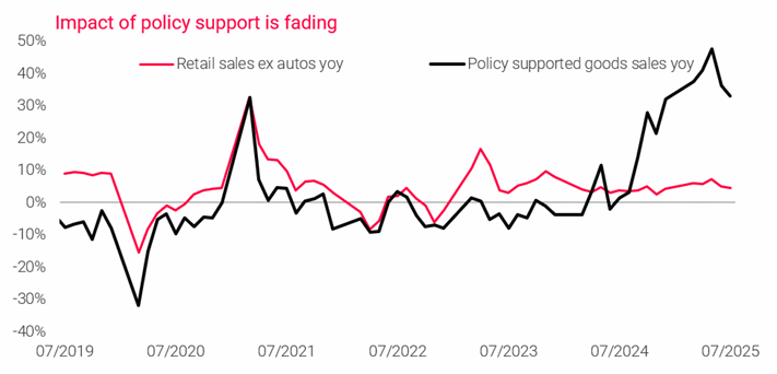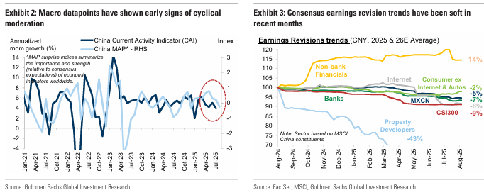 거시경제 지표는 7월부터 성장 피로 징후를 보였음. 2025년 남은 기간 동안 선제적 수출의 회수 가능성과 공격적이고 대규모 정책 부양책의 부재(그리고 시급성 부족)를 고려할 때, 2025년 남은 기간 동안 연속적인 성장 둔화가 예상됨. 2025년 EPS 성장률을 8~9%로 유지함.