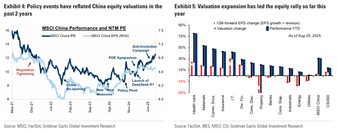 MSCI China와 CSI300은 주로 배수 확대에 힘입어 연초 대비 각각 27%와 11% 상승했는데, 작년 9월 중국 주식의 left tail 리스크를 해소한 정책 전환, 1월 말 "딥시크 모먼트", 2월 POE 심포지엄(민간 경제에 대한 규제 강화가 아마도 끝났음을 시사), 4월 말 이후 완화된 미중 무역 갈등, 7월 초 시진핑 주석이 합리적 경쟁 강화를 촉구한 중국 금융경제협회(CCFEA) 회의, 그리고 Anti-involution 레토릭 등이 그 예임. 이러한 사건들의 공통적인 특징이 주식/정책 위험 프리미엄을 압축하고 향후 수익 기대치를 높일 것이라 여기고 있음.