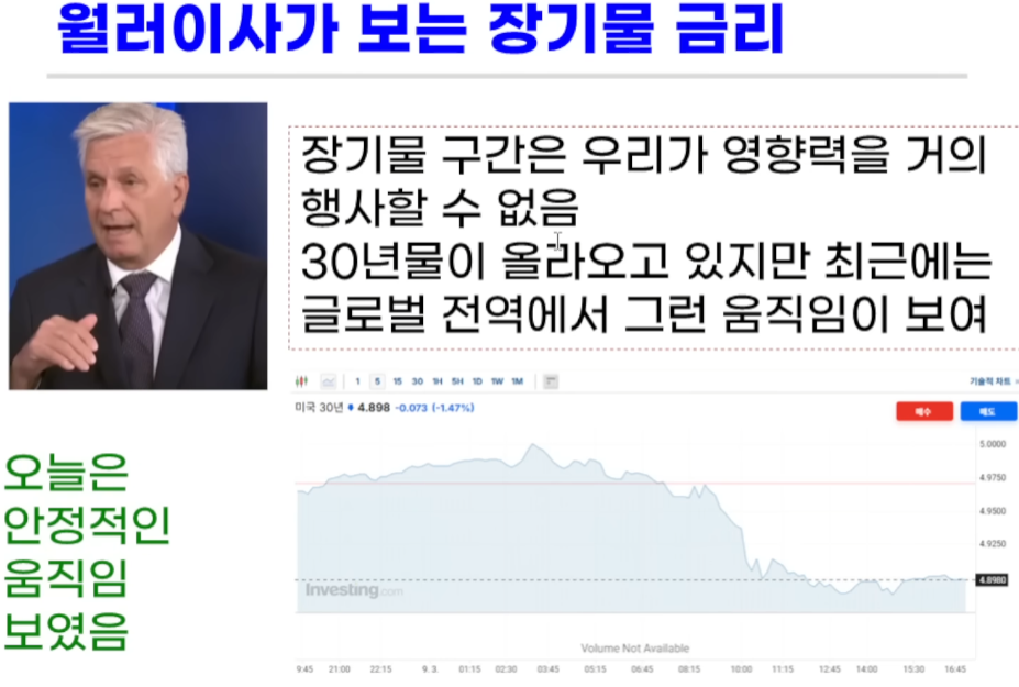 Q) 2년물은 금리인하 선반영으로 낮아지고 있고 10년물은 제자리 미국의 30년물 금리가 5%를 향해 가고 있다. 장단기 금리에 대해 어떻게 보는지에 대해 어떤 기자가 질문을 함.