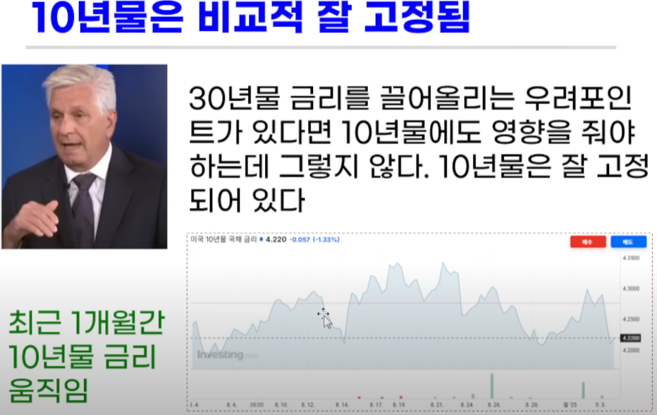 (주식과 같은 위험자산에 가장 큰 영향을 미치는 것이 10년물 금리인데) 30년물 같은 초장기채는 연준의 컨트롤하에 있지 않고, 10년물 금리는 큰 변동이 없으니 구조적인 문제로 볼 것은 아니라고 주장함.