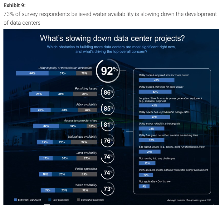 AI의 총 물 사용량은 전 세계적으로 미미해 보일 수 있으나, 그 영향은 매우 지역에 따라 매우 다름. 세계 주요 데이터센터 허브의 절반 이상이 이미 '중간정도의 수자원 위험'에 직면한 지역에 위치하고 있음. 이러한 취약성은 2차 시장과 성장 파이프라인에도 반영됨. 최근 애리조나주 투산이 아마존이 지원하는 프로젝트 블루를 거부한 사례는 모든 정부 부처가 수자원 보호를 위해 개입하고 있음을 보여줌.