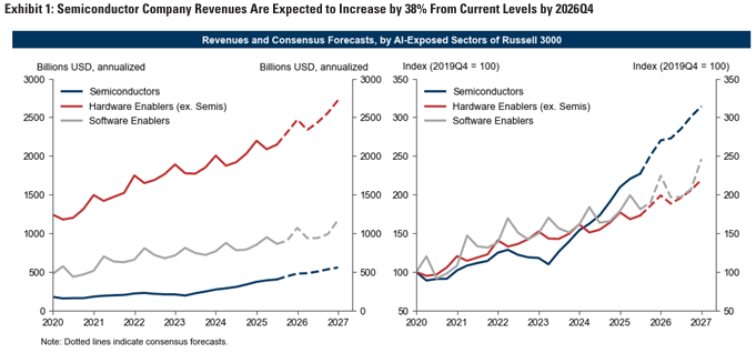 주식 시장에서는 지난 2년간 전력, 인프라 및 산업, 원자력 회사, 파이프라인 MLP 등 "AI 활성화" 테마가 시장 수익률을 상회했음.