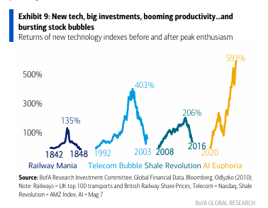 AI는 경제 전반의 생산성을 향상시켰지만, 초기 수혜자들에 의해 투자금을 빠르게 회수하지 못한 수많은 기술 중 최신 기술이 될 수 있음. 1800년대 중반 미국과 영국의 철도, 1990년대 광섬유 케이블과 인터넷, 2010년대 셰일 수압파쇄: 이 모든 기술에는 막대한 자본 지출이 필요했고, 그 효과는 초기 주식 거품이 터진 후에야 실현되었음(표 9).