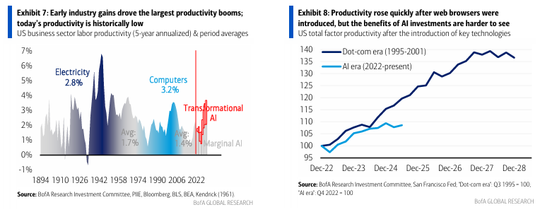 거대한 지출과 S&P 500 수준의 성장에도 불구하고, 경제 전반에 걸쳐 총요소생산성 향상에 대한 증거는 아직 많지 않습니다. AI는 혁신적일 수도 있고, 미미할 수도 있으며, 예상보다 더 오래 걸릴 수도 있음(표 7). AI는 노동 생산성 향상을 가져올 수 있지만, 자본 활용의 효율성이 떨어진다는 단점이 있음. 지금까지 닷컴 버블 시대와 비교했을 때, AI의 성장세는 그다지 좋지 않았음(표 8).