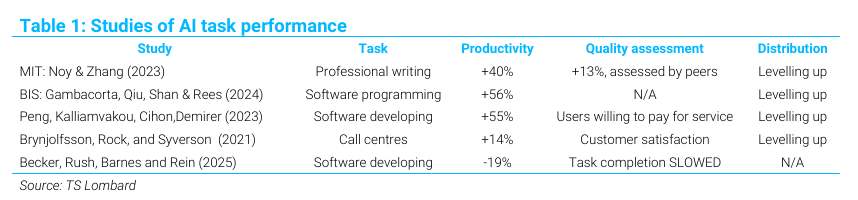 다행인 것은 LLM이 비록 결함이 있지만, "미시적" 수준에서는 특정 작업에서 상당한 효율성 향상을 가져올 수 있다는 것임. 표 1은 생산성 향상에 대한 최근 학술 연구와 그 결과를 요약한 것으로, 일반적으로 40~60% 범위임.
