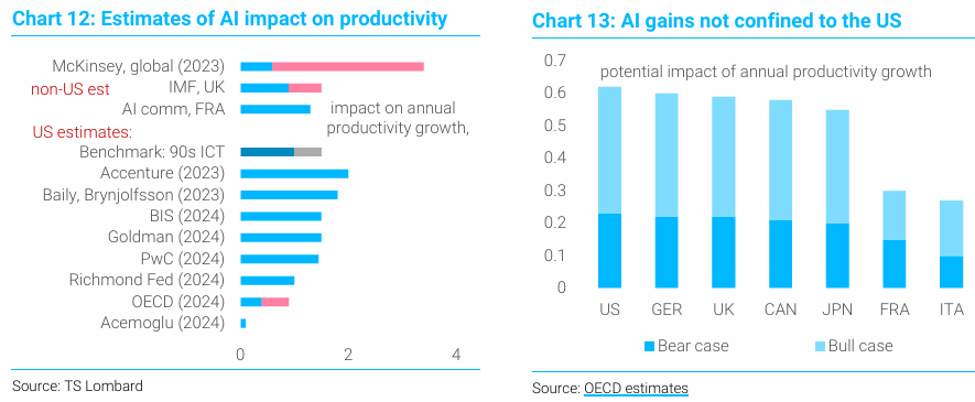 AI가 생산성에 미칠 것으로 예상되는 영향에 대한 추정치는 차트 12에 있음. 대부분의 추정치는 AI가 생산성을 연간 약 1~2% 향상시킬 것으로 예상.