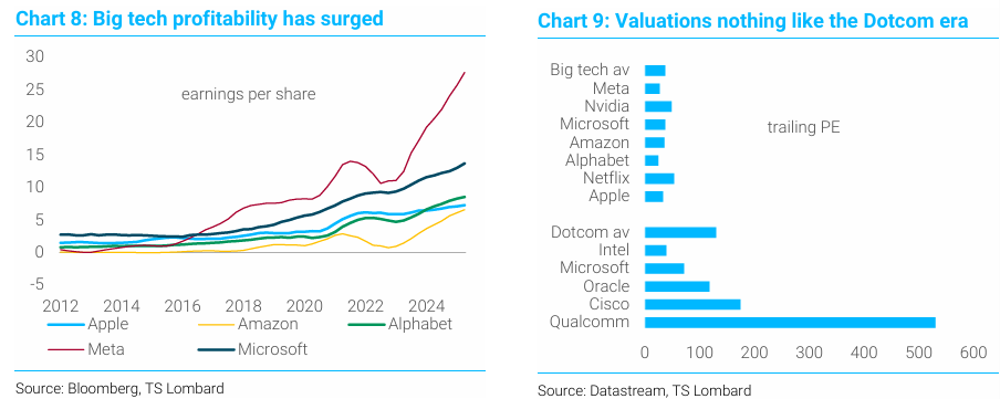 닷컴 시대와는 다른 수익성: 현재의 기술주 리더들은 닷컴 시대의 기업들과 달리 이미 높은 수익성을 입증했으며, "밸류에이션이 닷컴 시대와는 전혀 다르다(valuations nothing like the Dotcom era)"고 강조했음. 보고서의 차트 9에 따르면, 현재 기술주들의 주가수익률(trailing PE)은 25-50 범위이지만, 1990년대 후반에는 40-530 범위였음