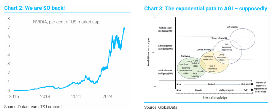AGI로의 지수적 경로: 강세론자들은 AI 혁명이 이제 막 시작되었으며, 빅테크 기업들이 AI에 막대한 자금을 계속 투자하여 기술 발전을 가속화하고 궁극적으로는 인간과 같은 인지 능력을 가진 '범용 인공지능(AGI)'을 개발할 것이라고 믿고 있음.