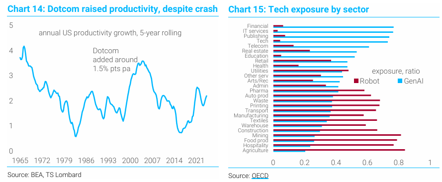 AI 생산성에 대한 극단적인 낙관론은 이 기술이 로봇 공학과 같은 다른 분야의 발전과 상호 작용하여 자동화될 수 있는 작업의 전체 비중을 크게 증가시킬 것이라는 것임. 미용업 등은 오늘날의 AI(챗봇 등)에는 취약하지 않지만, AI 기반 로봇에는 훨씬 더 취약할 수 있습니다. 한편, 이코노미스트는 기계가 인간을 대체하는 데 매우 능숙해져 자본 축적을 제한하는 유일한 요소가 자본 자체인 세상을 상상합니다. 이는 진정으로 폭발적인 성장으로 이어질 것.