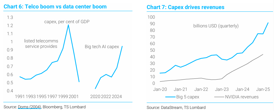 수익 및 투자 급증: 미국 기술 부문은 계속해서 수익이 급증하고 있으며, 데이터 센터와 IT 인프라 구축을 위한 대규모 자본 지출(Capex) 투자가 경제 전반에 가시적인 영향을 미치기 시작했음. 2025년 한 해 동안 주요 빅테크 기업들이 AI 관련 활동에만 400B달러 이상(미국 전체 GDP의 1% 이상)을 지출할 것으로 예상됨.