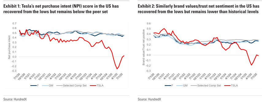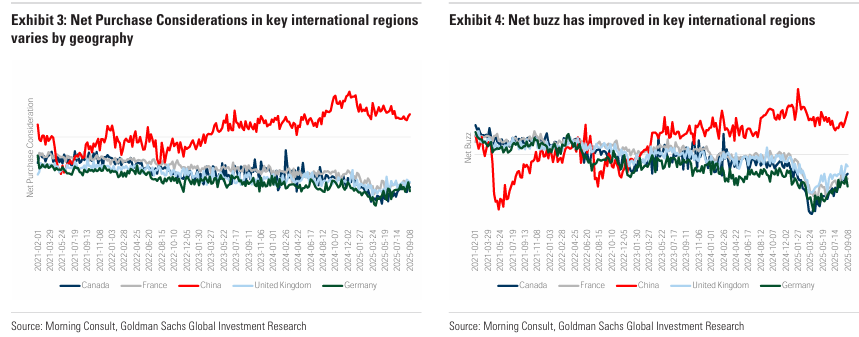 HundredX 및 Morning Consult에서 수집한 소비자 설문 조사 데이터를 검토하였으며, 표 1-표 4에서 볼 수 있듯이 북미와 유럽의 Tesla 설문 조사 점수는 최근 개선되었지만 여전히 역사적 수준보다 낮고, 중국에서 Tesla의 소비자 설문 조사 점수는 견조한 수준을 유지하고 있음.