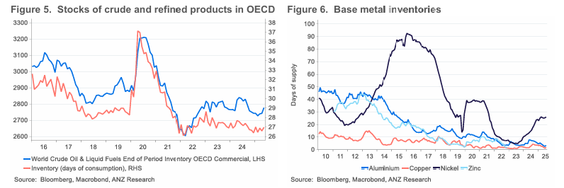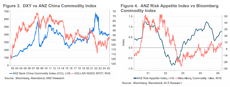 또한, 낮은 금리는 원자재를 포함한 위험 자산에 대한 투자자의 선호도를 높이며, 이는 특히 지난 5년 동안 두드러졌음. ANZ 위험 선호도 지수와 블룸버그 원자재 지수 간의 상관관계는 강했습니다(그림 4).