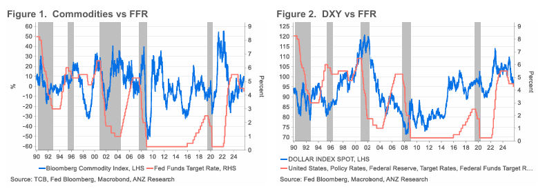 통화 정책이 상품에 미치는 가장 직접적인 영향은 외환 시장을 통해 나타남. FFR 인하는 미국 달러(USD)를 약세로 만드는 경향이 있으며, 이는 연준의 지난 5차례 주요 금리 인하 주기에서도 나타났음(그림 2).