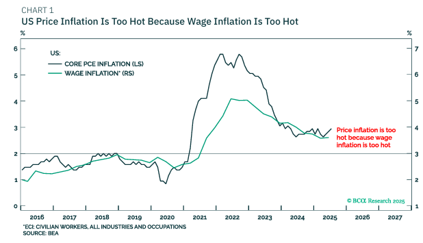 미국의 끈적한 인플레이션을 두고 관세탓을 하지만, 실제로는 2024년 초기이후로 미국의 인플레는 3%를 넘나들고 있었음. 미국의 고집스러운 인플레는 관세탓만이 아니며, 이것은 임금 상승이 너무 높기 때문임.