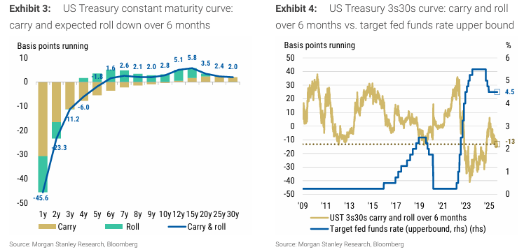 향후 6개월동안 3s30s 미국채 커브 스티프너 보유 비용은 13bp 일 것이며, 기준금리가 3.0%아래로 떨어질거라는 시장 가격을 감안하면 싼편