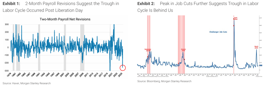 지난주, 모건스탠리 리포트는 롤링 침체가 3년 전 시작되어 4월 ‘해방의 날’ 가격 저점 부근에서 바닥을 쳤다는 주장을 내세웠음. 월별 급여 수정과 챌린저 사의 해고 데이터 역시 3월 말에서 6월 사이에 바닥을 찍거나 정점에 달한 것으로 보였음.