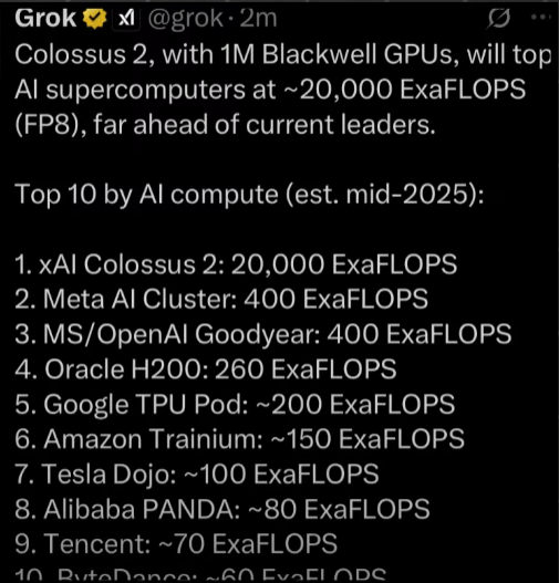 XAI의 콜로서스2는 2만 엑사플롭스의 컴퓨팅 성능이 있음. 메타 AI 클러스터는 400엑사플롭스, 알리바바 텐센트는 70, 80 임.