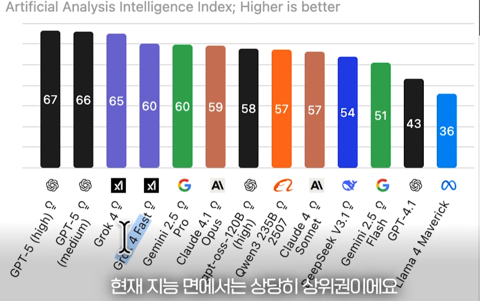 GROK 4 FAST는 지능면에서도 꽤나 상위권 ( 제미나이 2.5 pro와 비슷)