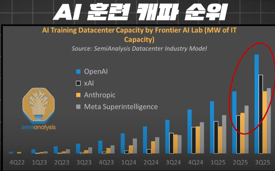 AI 훈련용 데이터 센터 용량을 보면 Open AI가 가장 크고 2위가 xAI임. 3위 메타 4위 앤트로픽임.