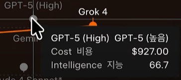 GROK 4 는 지능 65에 비용 $1888 // GPT 5는 지능 66에 $927