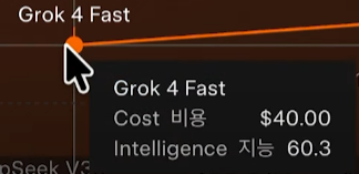 즉 Grok 4 Fast는 가성비 끝판왕에 등극됨.