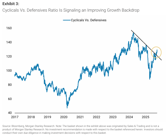 경기 민감주(Cyclicals) 대비 경기 방어주(Defensives) 비율이 2024년 4월 저점 대비 약 50% 상승하며, 2024년 4월부터 이어져 오던 하락 추세를 명확하게 돌파했음. 이는 시장 내부적으로 투자자들이 앞으로의 성장 환경이 개선될 것이라고 강력하게 시그널링하고 있음을 보여줬음.