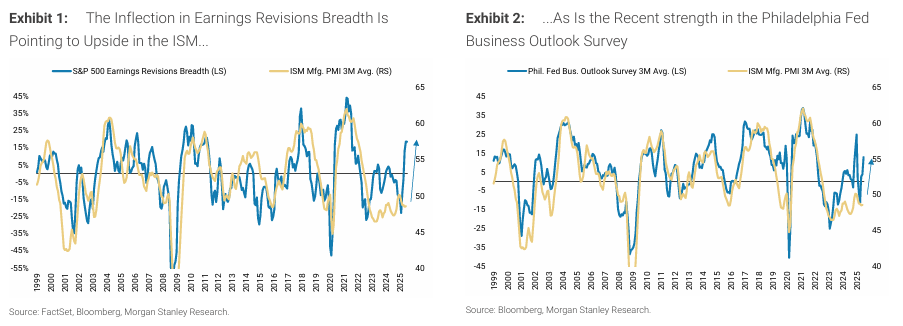 ISM 제조업 PMI 상향 시그널 (차트 1, 2 ): 이 실적 수정 폭의 강력한 반전은 필라델피아 연은 경기 전망 조사(Philadelphia Fed Business Outlook Survey)의 최근 강세와 더불어 ISM 제조업 PMI가 크게 상승할 것임을 명확히 시사했음. 실적 수정 폭과 필라델피아 연은 지수 모두 과거 ISM PMI의 선행 지표 역할을 했음.