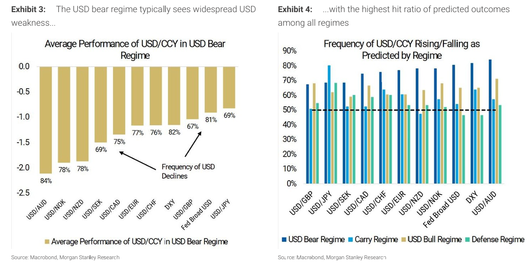 대부분 통화 대비 절상: 이 국면에서 통화들은 달러 대비 67%에서 84%의 높은 확률로 강세를 보였음. 이는 다른 통화 체제(Carry, Bull, Defense Regime)와 ...