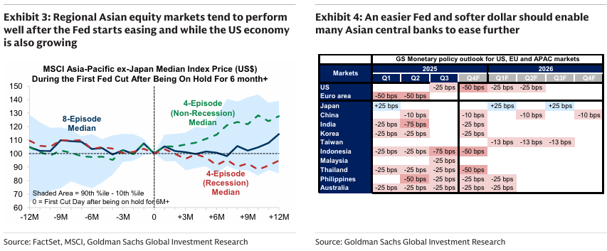 연준 완화와 달러 약세는 아시아 각국 중앙은행의 정책여지(금리 인하 여지)를 확대함. GS 이코노미스트들은 일본을 제외한 대부분 지역에서 추가적 완화(완만한 통화완화)가 가능하다고 보고 있으며, 일본은 장기간의 YCC(수익률곡선관리) 후 통화정책 정상화 지속을 예상함. 완화적 국내통화정책은 일반적으로 주식에 우호적.