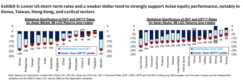 GS의 매크로 모델은 대부분의 아시아 시장·섹터가 미국 단기 금리 하락과 달러 약세에 역(−) 민감하다고 판단. 특히 북아시아(한국·대만·홍콩)와 경기민감·장기 듀레이션 섹터(자본재, 헬스케어)가 이 환경에서 강함. (문서 내 다중요인 모델·T-통계치 도표 참조).