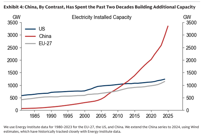 미국, 중국, EU-27의 전력 설치 용량(GW) 변화를 1985년부터 2025년까지 보여줌. 중국의 설치 용량이 2005년경부터 급격히 증가하여 2025년에는 약 3,250GW로 미국(약 1,250GW)과 EU-27(약 1,150GW)을 크게 초과하는 것을 나타냄.