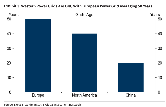 유럽은 약 50년, 북미는 약 40년, 중국은 약 20년으로, 서구권 전력망의 노후화 정도를 보여줌