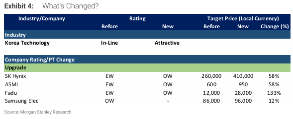 한국 기술 산업에 대한 견해를 In-Line에서 Charmant로 업그레이드하며, 삼성, 샌디스크, 키옥시아, SK 하이닉스를 NAND와 상품 DRAM 사이클 모두에서 선호하는 투자처가 될 수 있음.