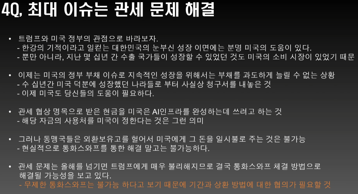 4Q에 관세 이슈가 모두 종료되면 일단 중요 이슈들은 모두 종료되는 것.