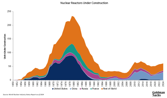 2017년부터 2024년 사이에 건설이 시작된 원자로 중 단 4개를 제외하고는 모두 러시아 또는 중국 설계이며, 현재 건설 중인 63개 원자로 중 거의 절반(29개)이 중국에서 건설되고 있음.