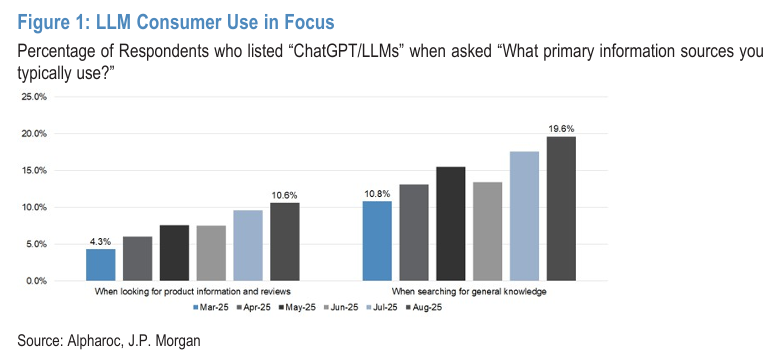 설문조사 데이터에 따르면, ChatGPT/LLM을 제품 정보 기본 소스로 사용한다고 응답한 사용자 비율이 1월 4.4%에서 8월 10.6%로 증가함.