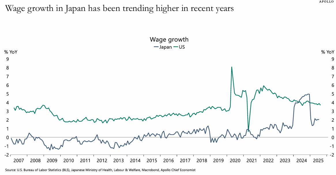 미국(US)의 임금 성장률은 2020년에 급격히 상승한 후 2024년에는 급격히 하락하는 큰 변동성을 보인 반면, 일본의 임금 성장률은 비교적 완만하고 꾸준한 상승 흐름