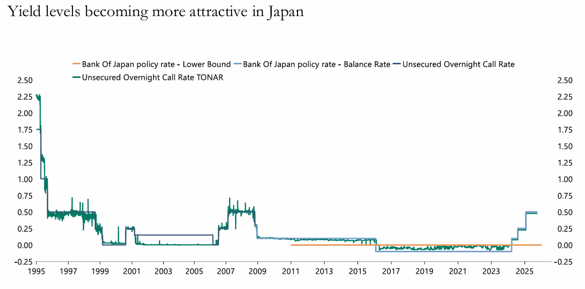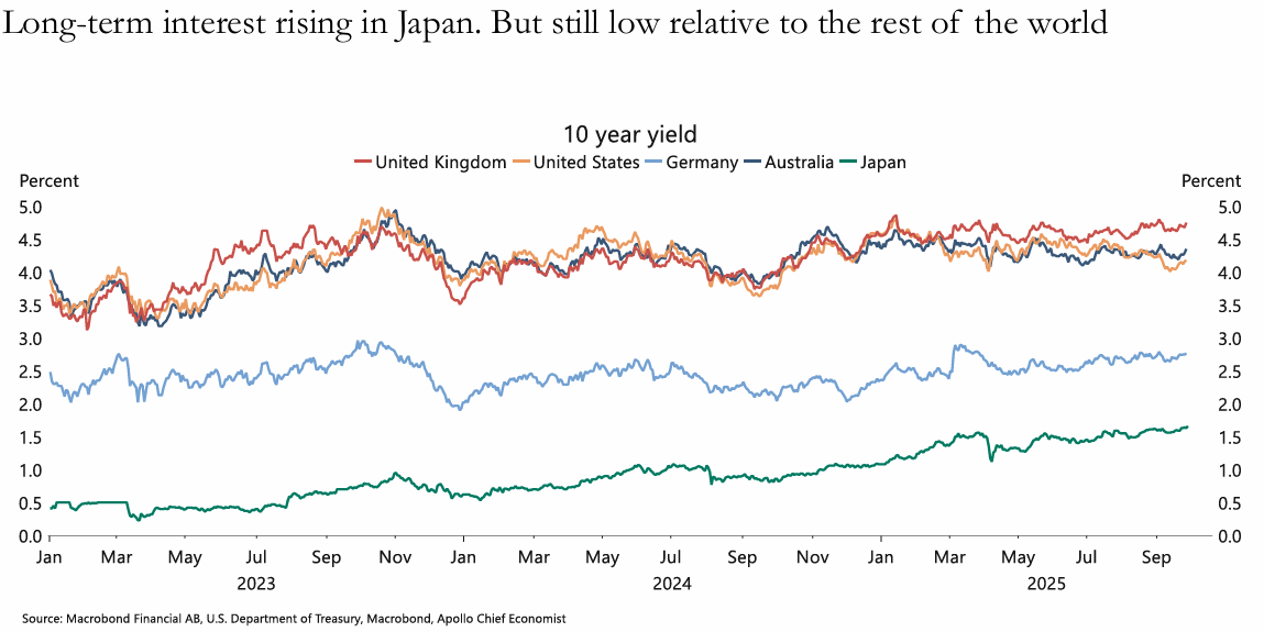 일본의 장기 금리가 상승하고 있으나, 여전히 다른 국가들에 비해 낮은 수준