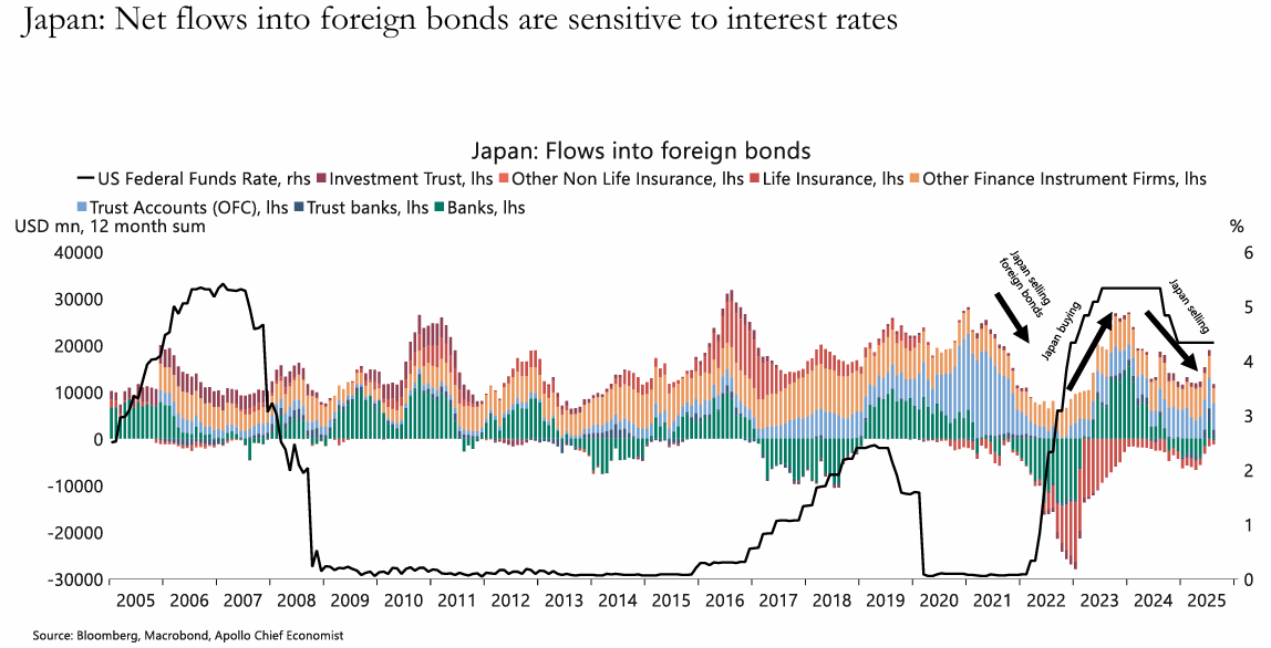 일본 투자자들은 해외 금리가 상승하여 매력이 높아지거나 국내 금리와의 차이가 확대될 때 해외 채권 투자를 늘리는 경향이 있음