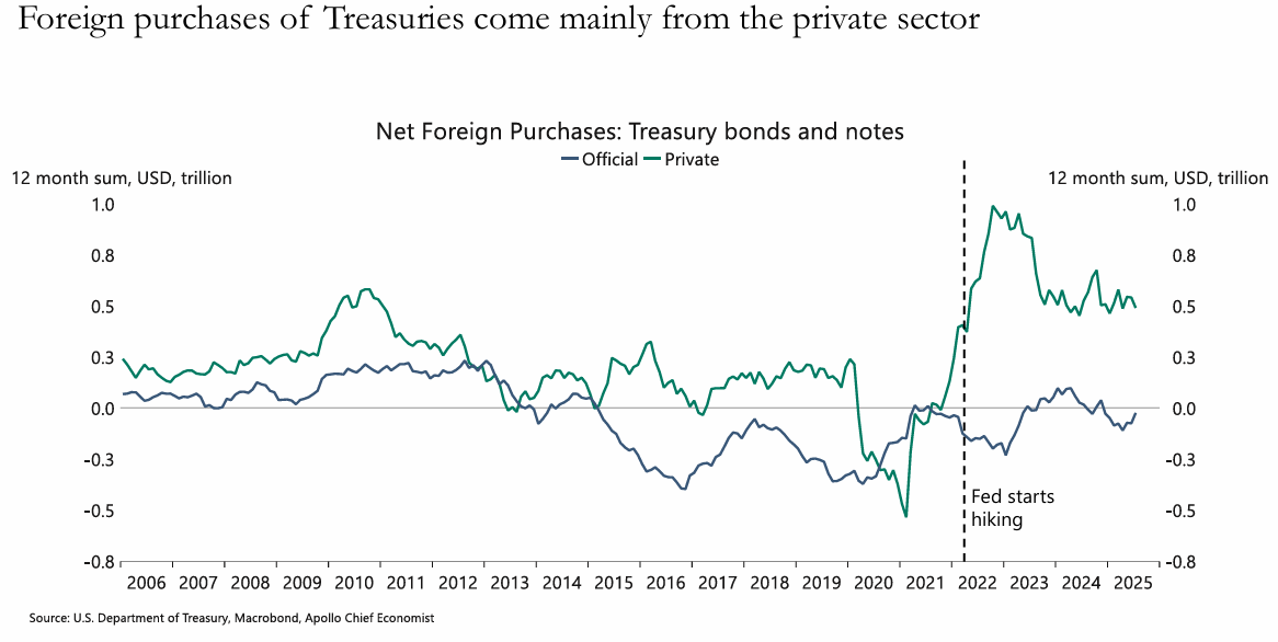 22년 FED의 금리 인상 이후 미국 국채에 대한 외국인 수요의 주된 동력은 중앙은행과 같은 공식 기관이 아닌 민간 투자자 (은행, 펀드, 기업 등)임