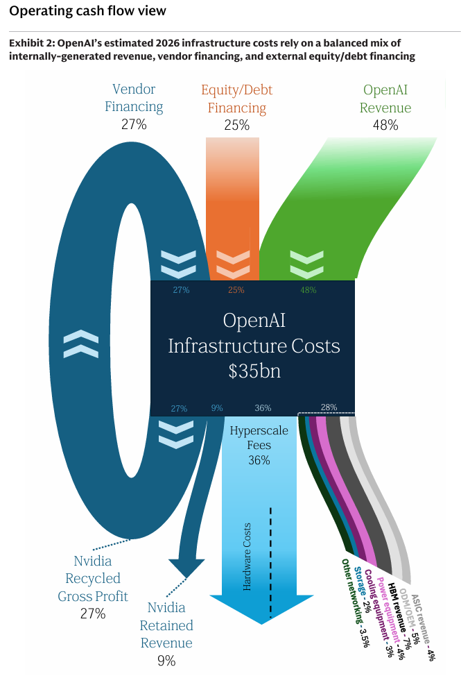 OpenAI의 2026년 인프라 비용 기반(~$35B)을 잠재적인 자금 조달 원천과 대조함. 2026년 OpenAI의 자금 조달 원천은 (1) OpenAI 매출 기여(48%), (2) 벤더로부터의 지분 조달(특히 엔비디아, 27%), (3) 기타 지분/부채 조달(25%)로 추정됨. 이는 OpenAI가 2026년 인프라 지출을 충당할 계획의 기초를 제공하며, 인프라 비용 기반과 각 자금 조달 원천을 도출한 심층적인 방법론을 아래에 제공함.