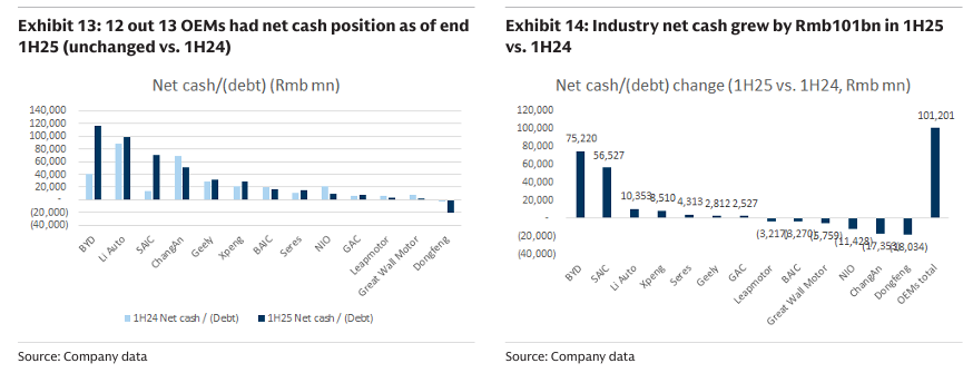 (Net Cash 현황): 1H25 말 기준, 13개 OEM 중 12개 업체가 순 현금 포지션을 유지하며, BYD가 가장 높은 순 현금 규모를 보유