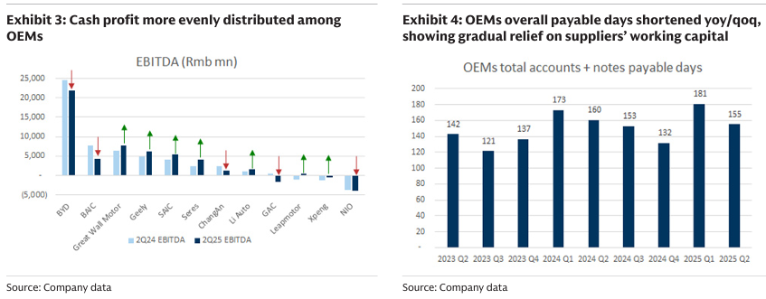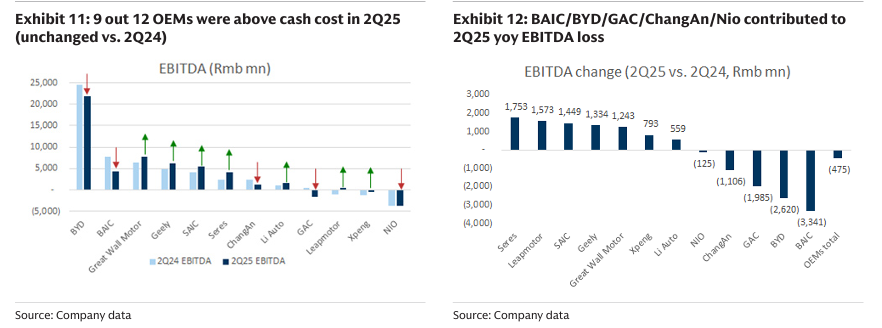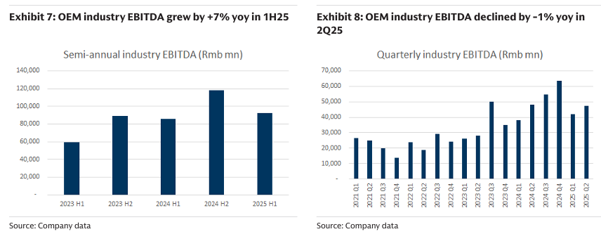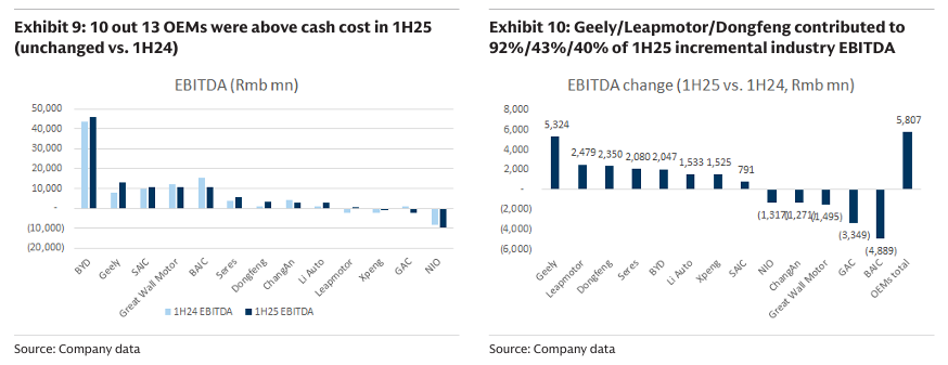 (1H25 EBITDA 변화): 1H25의 증분 산업 EBITDA(총 58.07억 위안 증가)에 Geely (92%), Leapmotor (43%), Dongfeng (40%)이 가장 크게 기여함. GAC는 가장 큰 EBITDA 감소폭을 기록