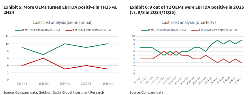 2025년 상반기(1H25) 기준, 13개 OEM 중 10개가 양(+)의 EBITDA를 기록하여 현금 비용 수준을 상회함 (1H24와 동일).