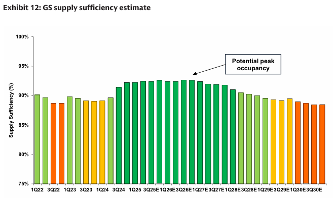 이로 인해 데이터센터 공급 충분도의 정점 시기가 기존 2025년 말에서 2026년으로 연장된 것으로 판단됨.