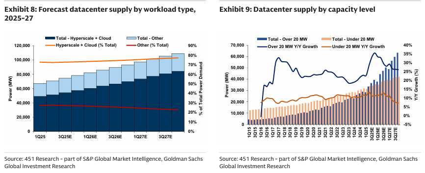Exhibit 8: 워크로드 유형별 데이터센터 공급 전망, 2025-27 & Exhibit 9: 용량 수준별 데이터센터 공급