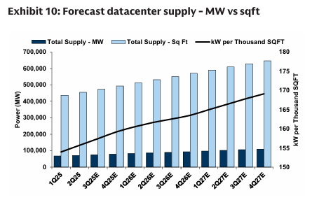 전력 밀도는 2027년에 평방피트당 157와트에서 169와트로 증가할 것으로 추정됨.