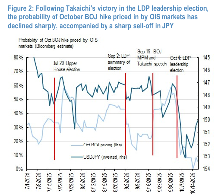 Figure 2: Following Takaichi's victory in the LDP leadership election, the probability of October BOJ hike priced in by OIS markets has declined sharply, accompanied by a sharp sell-off in JPY.